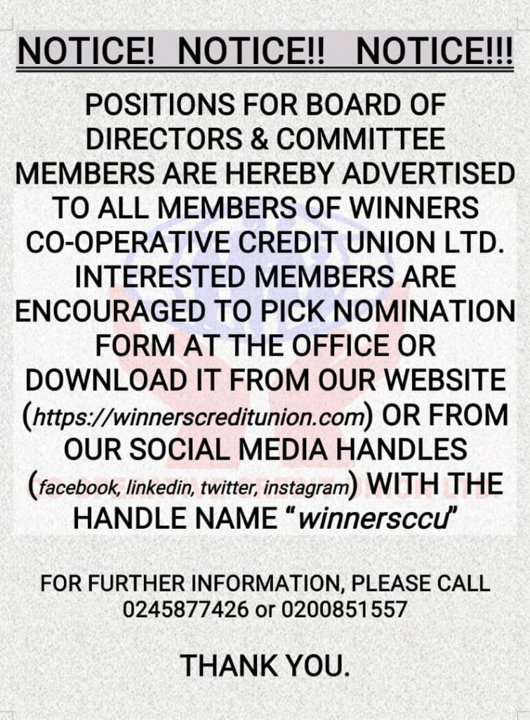 INTERESTED MEMBERS ARE ENCOURAGED TO PICK NOMINATION FORM AT THE OFFICE OR DOWNLOAD IT FROM OUR WEBSITE (https://winnerscreditunion.com) OR FROM OUR SOCIAL MEDIA HANDLES